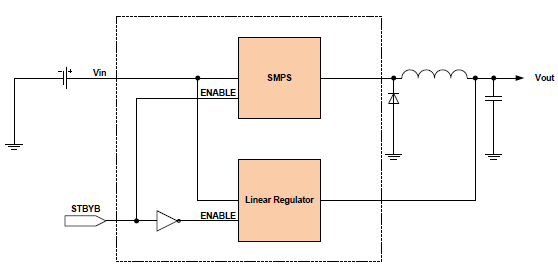 Where the load current is high or power dissipation needs to be minimised then a switched mode power supply (SMPS) needs to be considered. As discussed in my previous blog, one way of achieving this is by use of techniques such as pulse frequency modulation (PFM) or burst-mode, but another means might be the use of an integrated hybrid topology where a linear regulator and an SMPS are used in parallel.