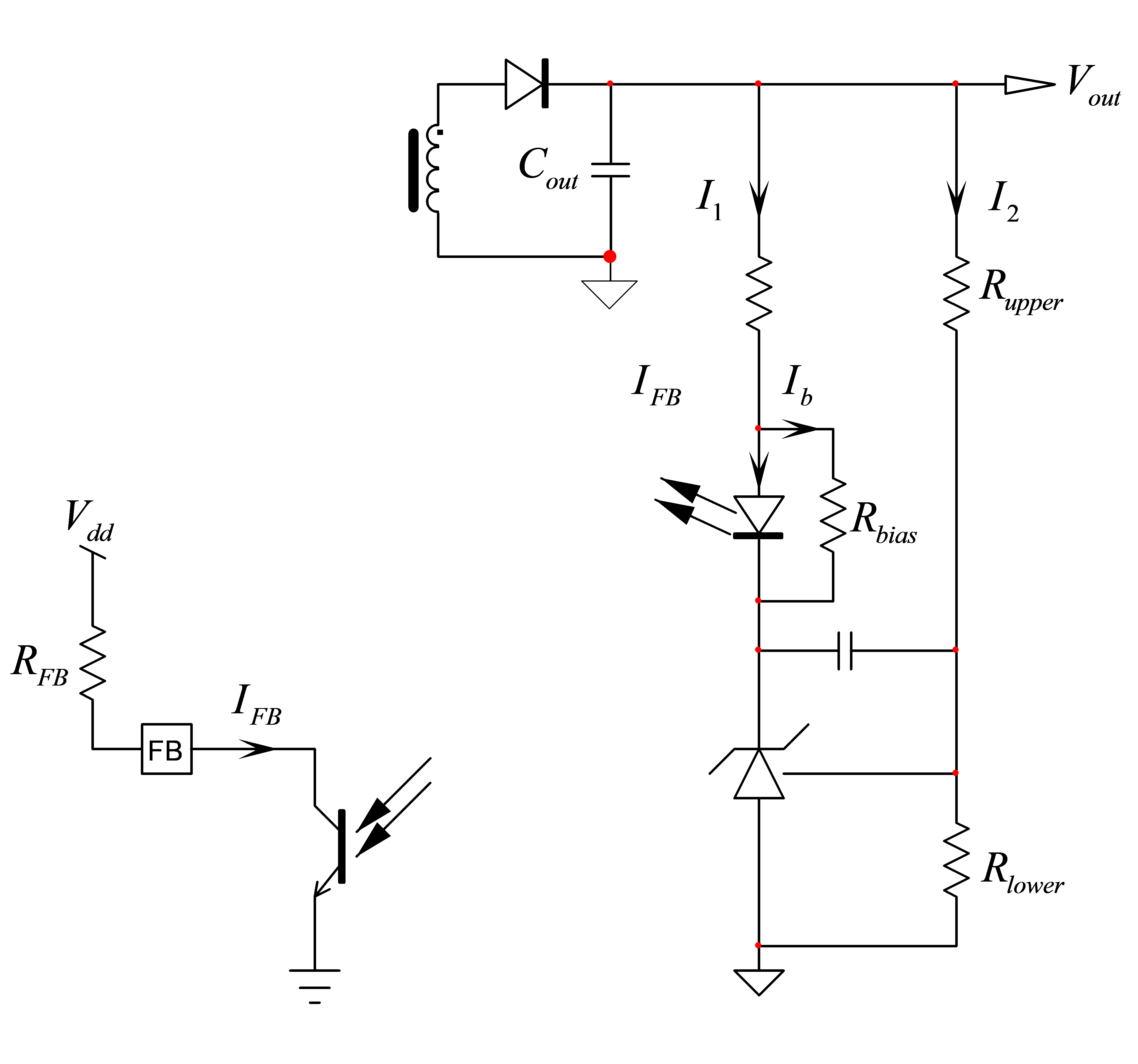 A TL431 aggregates 11 bipolar transistors to form an op amp and a 2.5-V reference voltage. The part directly operates from the current absorbed by the cathode. This current must be 1 mA minimum as stated in the component data-sheet. This 1 milliamp comes on top of the feedback current necessary to produce IFB in the primary side. Capitalizing on the LED 1-V forward drop, resistor Rbias builds a cheap current generator with the optocoupler LED. If Rbias is 1 kΩ, then you roughly inject 1 mA. Assuming a primary-side pull-up resistor RFB of 20 kΩ and an internal Vdd of 5 V, the maximum current needed to move the feedback voltage between 5 V and 0.3 V (the optocoupler saturation voltage) is found to be