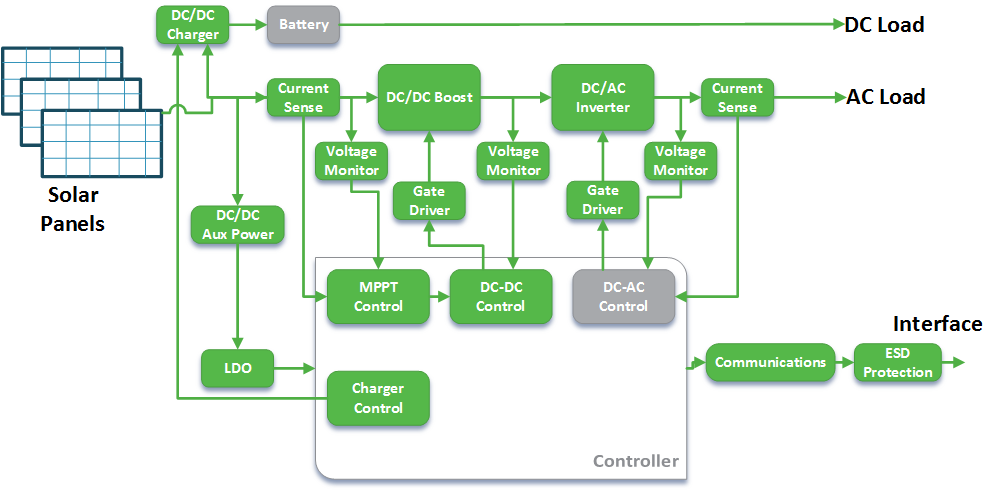 ON Semiconductor’s boost and inverter Power Integrated Modules (PIMS) anchor the solar power system, while our gate drivers, sensing, control, and peripheral power products complete the system.