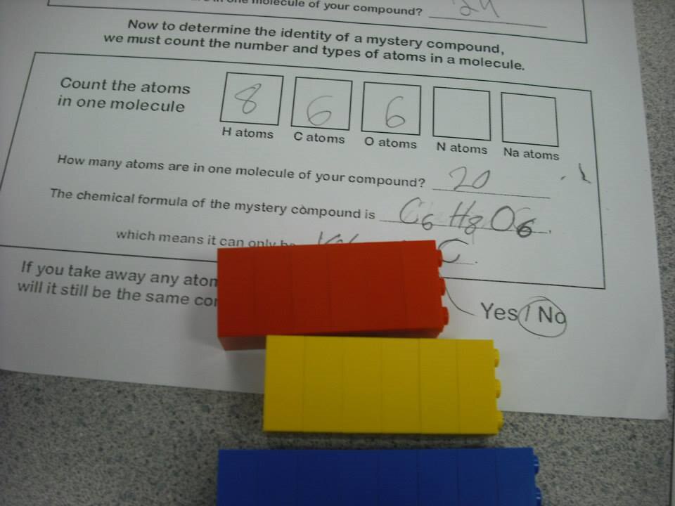 Another creative use of funding was the Lego® Molecules project. Here, students explore the science of molecules using various colors of Lego blocks. Each Lego color represents a type of element (IE: Hydrogen, Oxygen or Carbon), and like colors are combined to show how many atoms of each element are contained in the molecule. So for Vitamin C, whose chemical formula is C6H8O6, this could be represented by six red blocks, eight blue blocks and six yellow blocks. Now the kids can visually see the molecular structure and apply the same principles to other chemical formulas.
