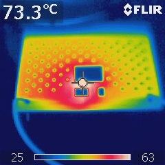 Here the NUD4700 is running at 1.3 A with a case temperature measured by a FLIR camera of only 73.3 °C. The device is mounted on a test PCB and the crosshair of the IR camera is on the top of the device.