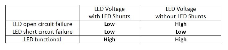 As a fan of simplicity over complicated solutions, Alfred had naturally decided on the use of LED shunts to solve this problem, essentially converting an open circuit into a short circuit. If an LED has a shunt across it and it fails either as a short or an open, its voltage drop will be low. To monitoring circuitry, a functional LED will have a high logic level and a failed LED will have a low logic level. As the table below illustrates, there are only two possible LED voltage levels when the shunt is used.
