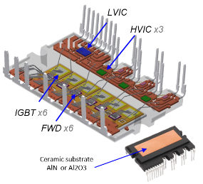 These modules have a six device IGBT power-bridge along with soft recovery anti-parallel diodes, optimized for motor control applications (Figure 2). Three high-side gate drivers, single low-side gate driver and is constructed on an isolated ceramic substrate. The ASPM modules are constructed using a Direct Bond Copper (DBC) substrate process. This construction sandwiches a ceramic sheet between two thin copper layers. The top copper is patterned to create the circuit interconnections, while the bottom copper is used to conduct the heat away to the heatsink. Different types of ceramic substrate materials are available for various levels of thermal performance. Both Alumina (Al2O3) and Aluminum Nitride (AIN) substrates are available. The circuit components are soldered on to the top DBC layer and the entire package is epoxy encapsulated. The final product is housed into a rugged, hermetically sealed, thermally efficient package. These modules are automotive qualified to both AQG324 and AEC-Q10x specifications.