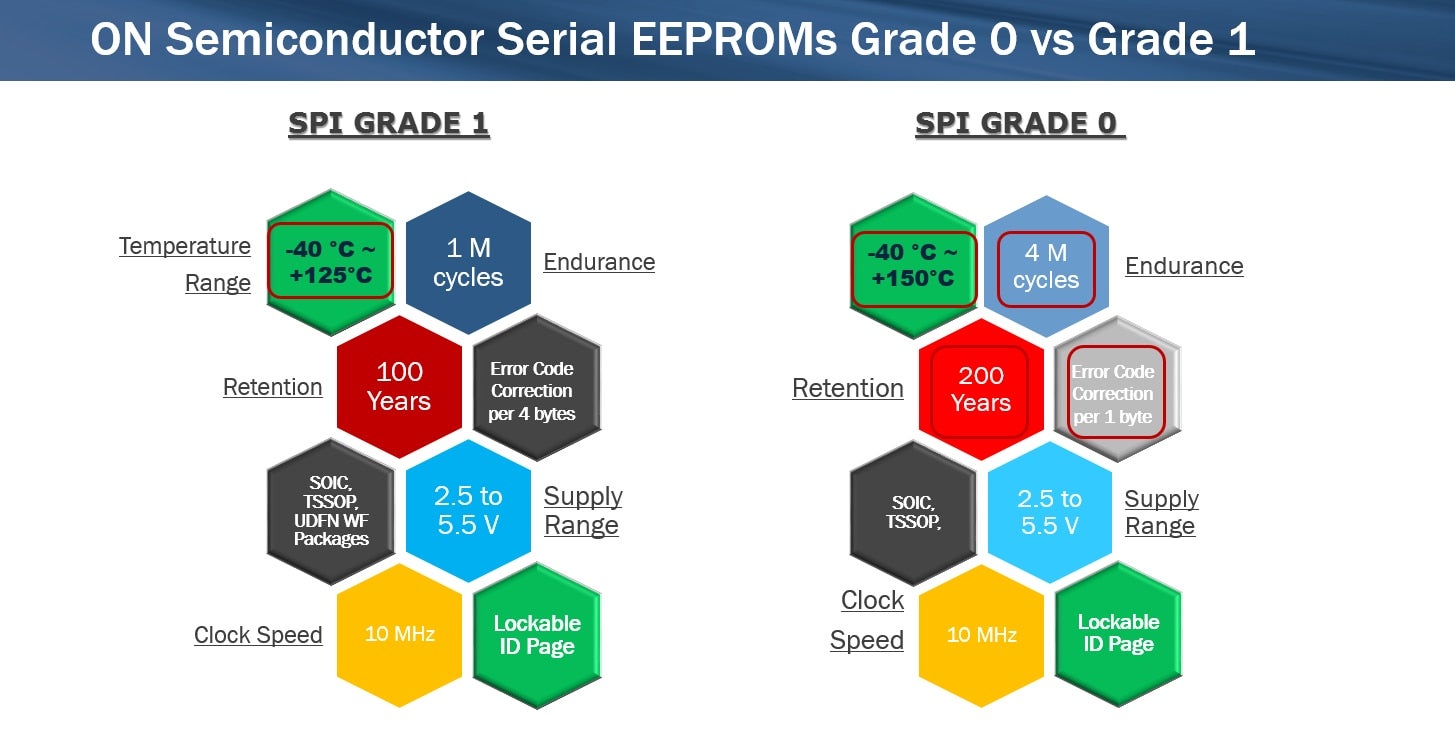 The processes used to manufacture EEPROM are much more suited to withstanding harsh environments, which is particularly evident in ON Semiconductor’s family of AECQ-100 Grade 1 and Grade 0 EEPROMs. The flagship devices in this portfolio are the NV25080, NV25160, NV25320 and NV25640, which are true Grade 0 EEPROMs offering 8, 16, 32 and 65 kbit densities respectively.