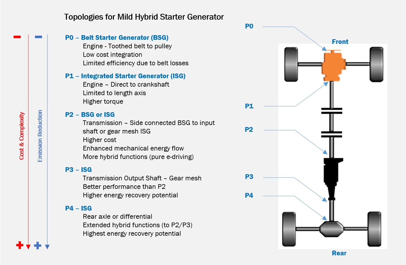 If mounted at P0 or P1, functionality is limited to start-stop and energy recovery. While P0 and P1 locations are easier places to integrate the unit, the benefit on emissions is the lowest here, as there is no energy recovery if the ICE is not rotating. In this arrangement the ICE shutdown algorithm is less aggressive, which reduces CO2 savings.
