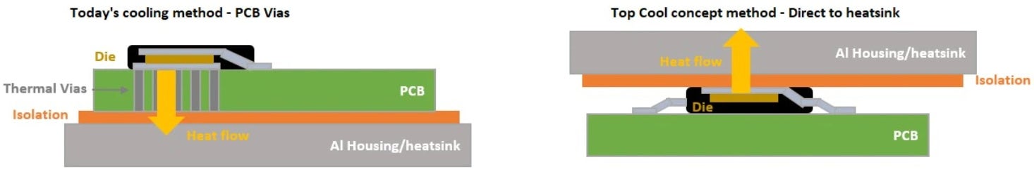 Top-side cooling provides a more direct thermal path for heat dissipation, which allows for better heat transfer from the power semiconductor components to the heat sink. This results in lower operating temperatures and improved efficiency, critical for high-power step-down conversions in automotive applications. Top-side cooling technology can provide up to 70% improvement in thermal performance compared to traditional bottom-side cooling techniques. This is due to the more direct thermal path provided by top-side cooling, which allows for better heat transfer and dissipation.