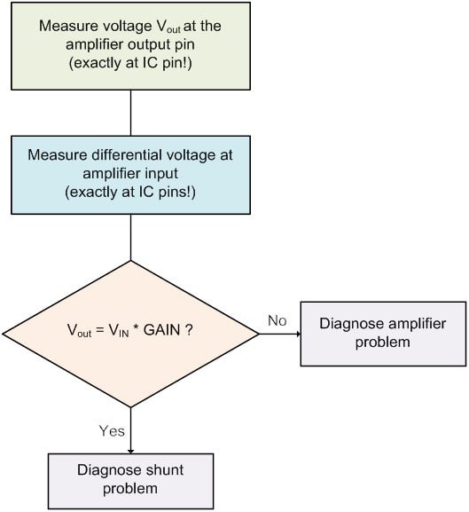 The bulleted list below, along with the Decision Tree Figure and Debug Table below can be used in diagnosing shunt current measurement errors for any current sense amplifier circuit.