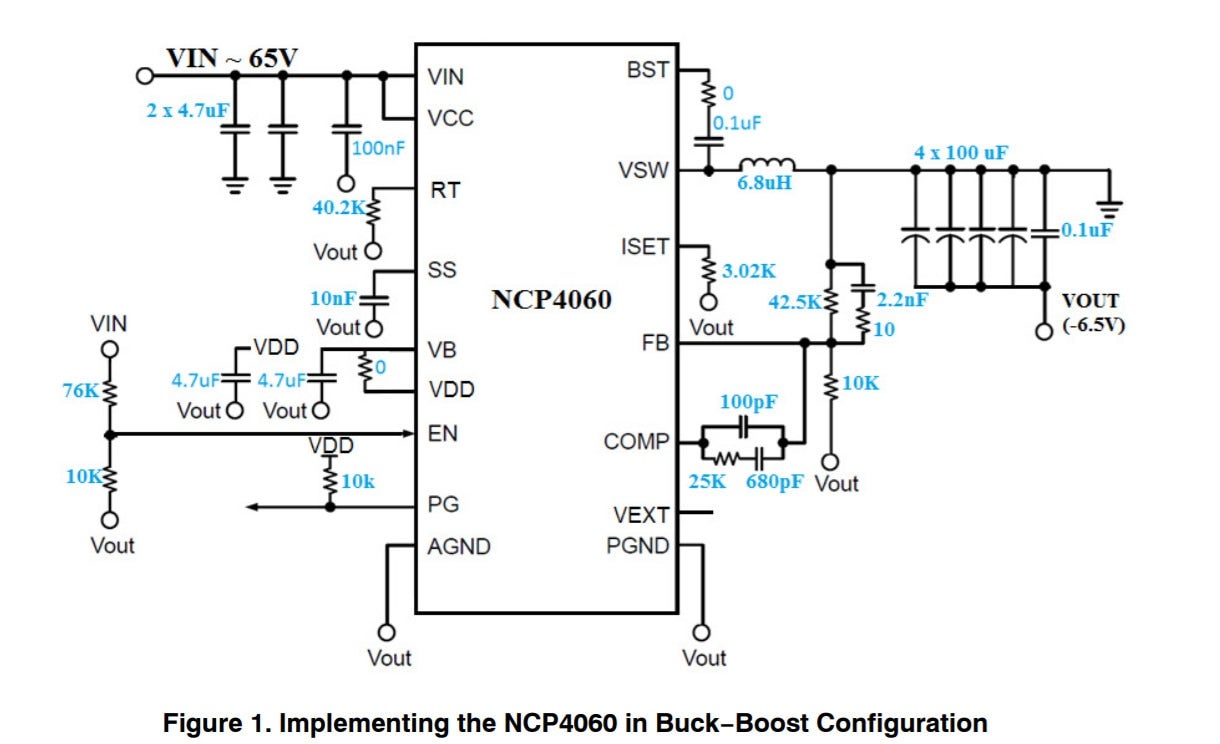 There are a number of important factors and challenges to consider when adopting buck-boost topologies. ON Semiconductor’s NCP4060A is an 80V synchronous buck regulator with integrated power FETs that can accommodate up to 6A DC loads. It is a good example of a device that provides the flexibility to down convert from high input voltages to negative output voltages just by exchanging Vout with Gnd on a buck.