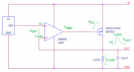 The case of overshoot at the output of LDO (Figure 2) is the opposite of the undershoot situation. Overshoot is 0.02 V, so the output voltage is 1.02 V. There is a voltage difference of -0.02 V between the inputs of the error amplifier. The error amplifier amplifies this voltage again, and the output voltage of the error amplifier VAMP increases while the voltage VGS of the PMOS pass device decreases, meaning the PMOS pass device starts to close its channel. But just because of that, one pass device can charge the output capacitor in case the overshoot output voltage returns to 1 V when the output capacitor discharges.