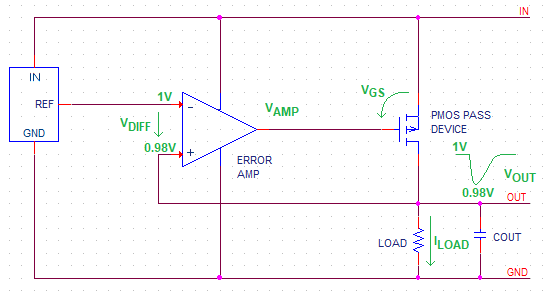 Let’s look at what happens inside the LDO when an undershoot appears at its output. Figure 1 shows an LDO internal structure with an output voltage of 1 V and Transient Response undershoot of 0.02 V, resulting in an output voltage drop to 0.98 V. When the reference voltage stabilizes to 1 V, then there is a voltage difference of 0.02 V between the inputs of the error amplifier. The amplifier amplifies that voltage, so the output voltage of the error amplifier VAMP decreases, meaning the VGS of the PMOS pass device increases, and the PMOS pass device starts to open its channel more to charge the output capacitor. So, the output voltage of the LDO starts to increase back to 1 V.