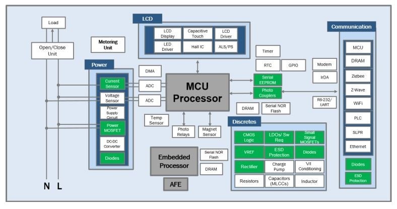The Power Solutions Group’s portfolio offers many solutions for smart e-meters such as the NCS21xR current sense op-amp with integrated gain resistors and ultra-low input offset voltage to minimize power dissipation across the shunt resistor. We have industry leading high PSRR/low noise LDO portfolio for high performance voltage regulation and a broad optocoupler portfolio for isolation purposes.