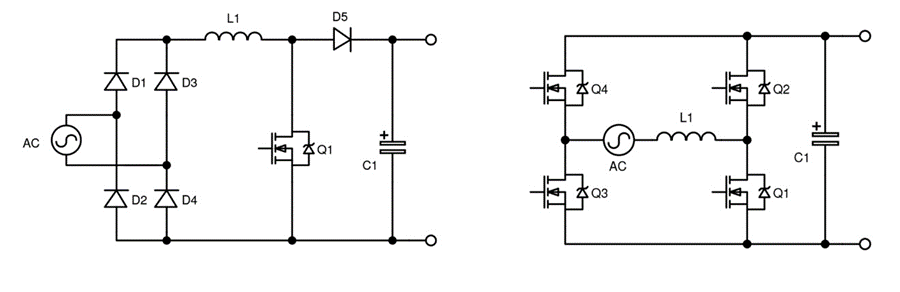 Traditional (left) and bridgeless Totem Pole (right) boost PFC circuits