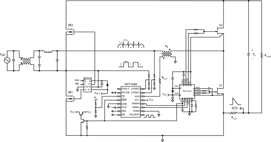 Adoption of the totem pole architecture has been largely driven by adoption of Silicon Carbide (SiC) and Gallium Nitride (GaN) devices because of their advantages (mainly low reverse-recovery charge) when used in the fast leg of the totem pole. The NCP1680 can accommodate any switch type whether it is silicon based super junction silicon MOSFETs or SiC or GaN devices.