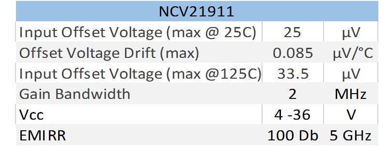 At ON Semiconductor, we offer two types of precision operational amplifiers, NCS21911 & NCV21911, which are excellent choices that meet the requirements of exact performance over a broad temperature range (-40oC to 125oC) and maintains this performance over the many years of operation required by the industrial market. The specifications of precision input offset voltage and precision input offset voltage drift over temperature support industrial robot applications in many areas, a familiar one is automobile manufacturing. The innovative technology used is Zero-Drift, most operational amplifiers performance differs as temperature changes and as the product ages. The Zero-Drift innovation is that internally the operational amplifier self-corrects for performance drift. The same Zero-Drift technology used to achieve the very low offset drift over temperature also corrects for input offset voltage drift over time. See Table 1.