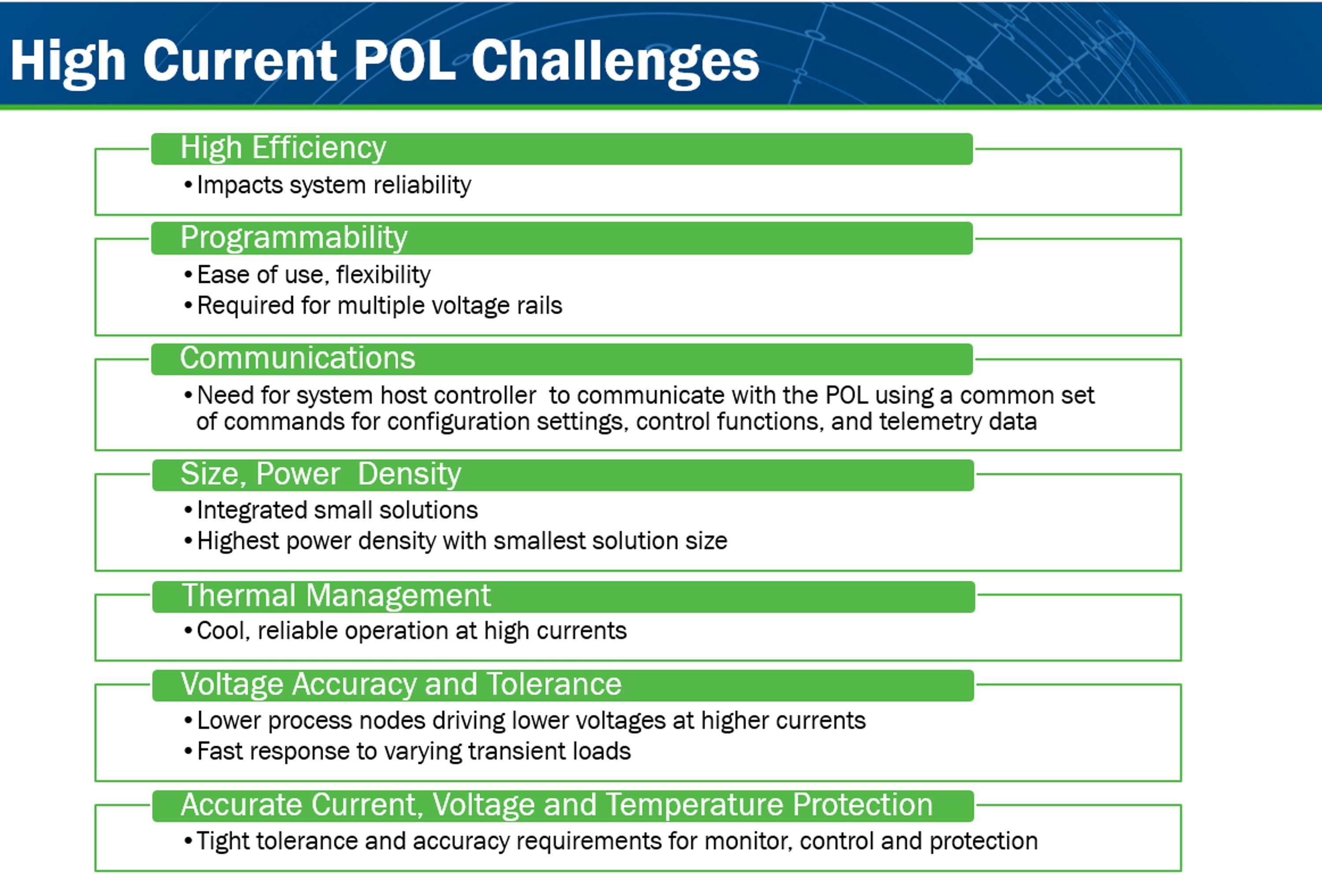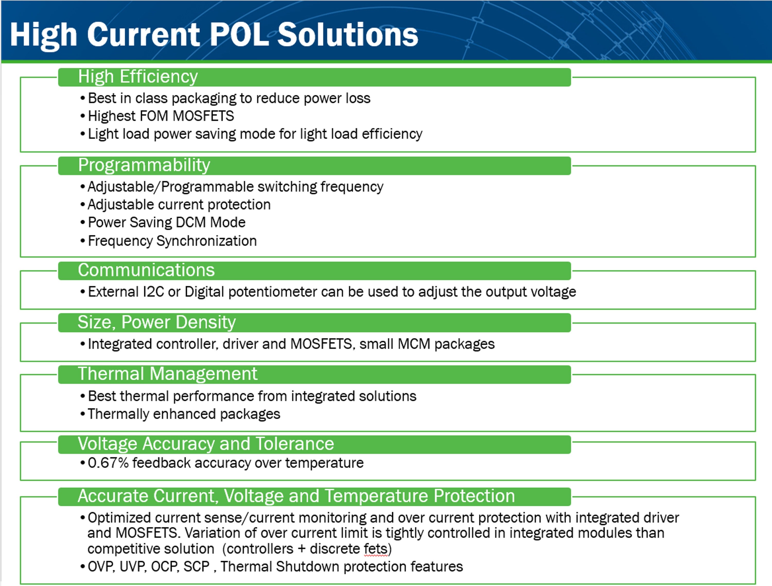 These include high efficiency with the right power density, of course, but extend to programmability and flexibility, with fast transient response, tight tolerances and accuracy. All this, has to be wrapped up in a solution that has reliable current and voltage protection with excellent thermal management.