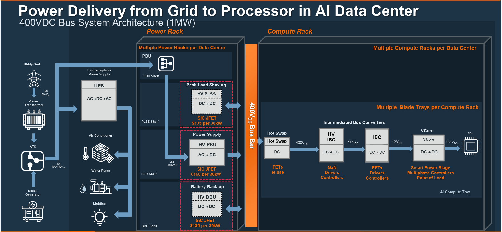 Data center power delivery from the grid to the GPU rack goes through many power conversions. Intelligent SiC and silicon (Si) power solutions are instrumental to each branch of the power tree. Power first goes through a solid-state transformer (SST) and an automatic transfer switch (ATS) control which is backed up by a diesel generator. The 20k VAC line is converted to a three-phase 400 VAC, and then goes through an uninterruptible power supply (UPS). EliteSiC discrete and power modules can be used to deliver higher efficiency and power density at this entry point into the data center. The power distribution unit then converts the three-phase 400 VAC to a single-phase 230 VAC line at the rack level.