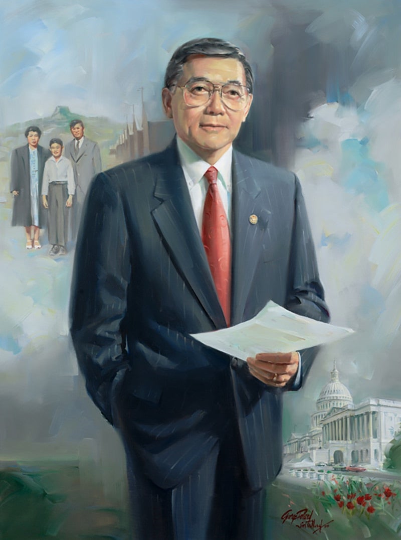 A portrait of every former Chair of The House Transportation and Infrastructure Committee hangs in the committee’s hearing room on Capitol Hill. The painting of Mineta includes in the lower right corner a picture of the Capitol and in the upper left corner a picture of him and his parents at the internment camp in Wyoming, underscoring the arc of his life’s journey.