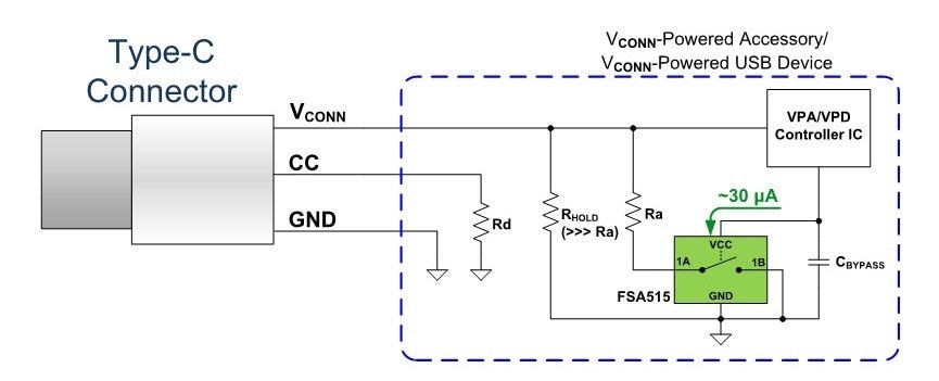 Consider the application of having a mobile device connected to a powered accessory through a USB Type C cable. Once the accessory is attached and powered through VCONN, there can still be a current drain through the Ra resistor to ground on the accessory side (Figure 2). For a VCONN of 5V and Ra of 1 kilo-ohm, this gives 5 mA of DC current that is unnecessarily being drawn from the mobile device. However, for accessories that use a micro-controller or similar device, a single-channel SPST depletion-mode analog switch such as the FSA515 on the accessory device in series with the Ra resistor can enable the ability to isolate the Ra resistor path to ground after USB Type C detection is complete.