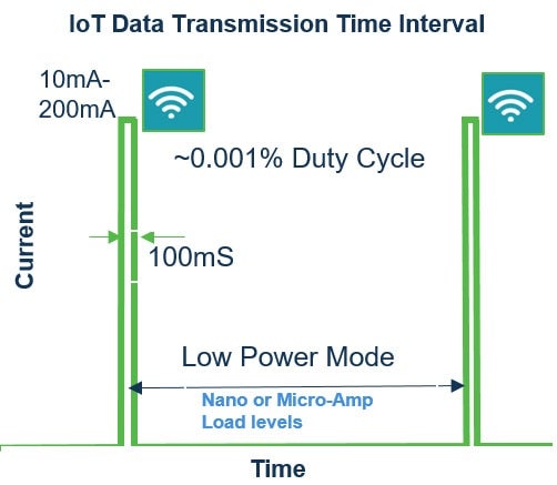A common technique for achieving a 10-year battery life is to leverage the fact that IoT devices are inactive for the majority of the time and only need to support infrequent radio transmission of small data payloads. In most cases, sensor measurements are also infrequent. One example is an agricultural sensor node, which takes a handful of sensor measurements such as for temperature and humidity per day, followed by a daily transmission of data to the network. In terms of battery life, this is significant because most of the power draw from the battery occurs when transmitting or receiving data using either Bluetooth® Low Energy, Wi-Fi or Sub-Ghz, depending on the type of sensor used. When the IoT node is not transmitting or sensing, it will be sitting mostly in idle or low power mode with very little power draw from the battery. The percentage of time, known as Duty Cycle, of which the device is in active mode is easily less than 1 percent for most use cases, meaning that it is in low power mode for the remaining 99 percent. The infrequency of these power-hungry tasks can therefore significantly reduce power consumption and aid in extending battery life.