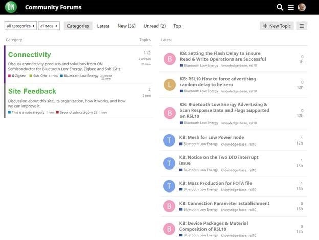 The onsemi Community Forums is an online development community supporting wireless connectivity solutions. To get started, simply log in using a MyON account. The community is set up to let members quickly find information using categorization views and content searching.