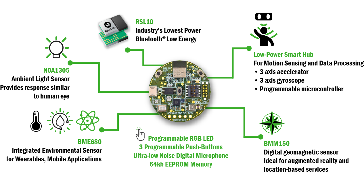 The combination of power optimized wireless and sensor technology can enable a variety of new applications within IoT. The RSL10 Sensor Development Kit enables this technology with it's multi-sensor, Bluetooth® Low Energy platform featuring the RSL10 SIP (System-in-Package), the industry’s lowest power Bluetooth® Low Energy radio. The board features over ten sensors including ambient light, inertial and environmental sensors. The combination of cutting-edge sensor technology and the ultra-low-power Bluetooth® Low Energy radio results in a device that enables development of sensor edge-nodes with a long battery life for various applications. With this platform, we wanted to provide developers and design engineers a compact form-factor, comprehensive and energy efficient solution to accelerate development time and effort in creating node-to-cloud IoT solutions.