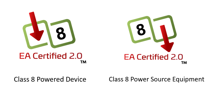 Recently announced by the Ethernet Alliance, the Gen 2 PoE Certification Program was designed to allow interoperable products to be designed quickly and easily in accordance with the IEEE 802.3bt standard. The main goal of the program is to enhance the user experience by minimizing confusion between IEEE standard-based PoE and proprietary solutions. To this end, the program introduces new end user equipment logos, indicating the type of product and the power class supported. Power Source Equipment (PSE) is indicated by an arrow flowing out of the icon, while an arrow flowing into the icon is used to represent a Powered Device. The power class is designated by the second box of the logo.