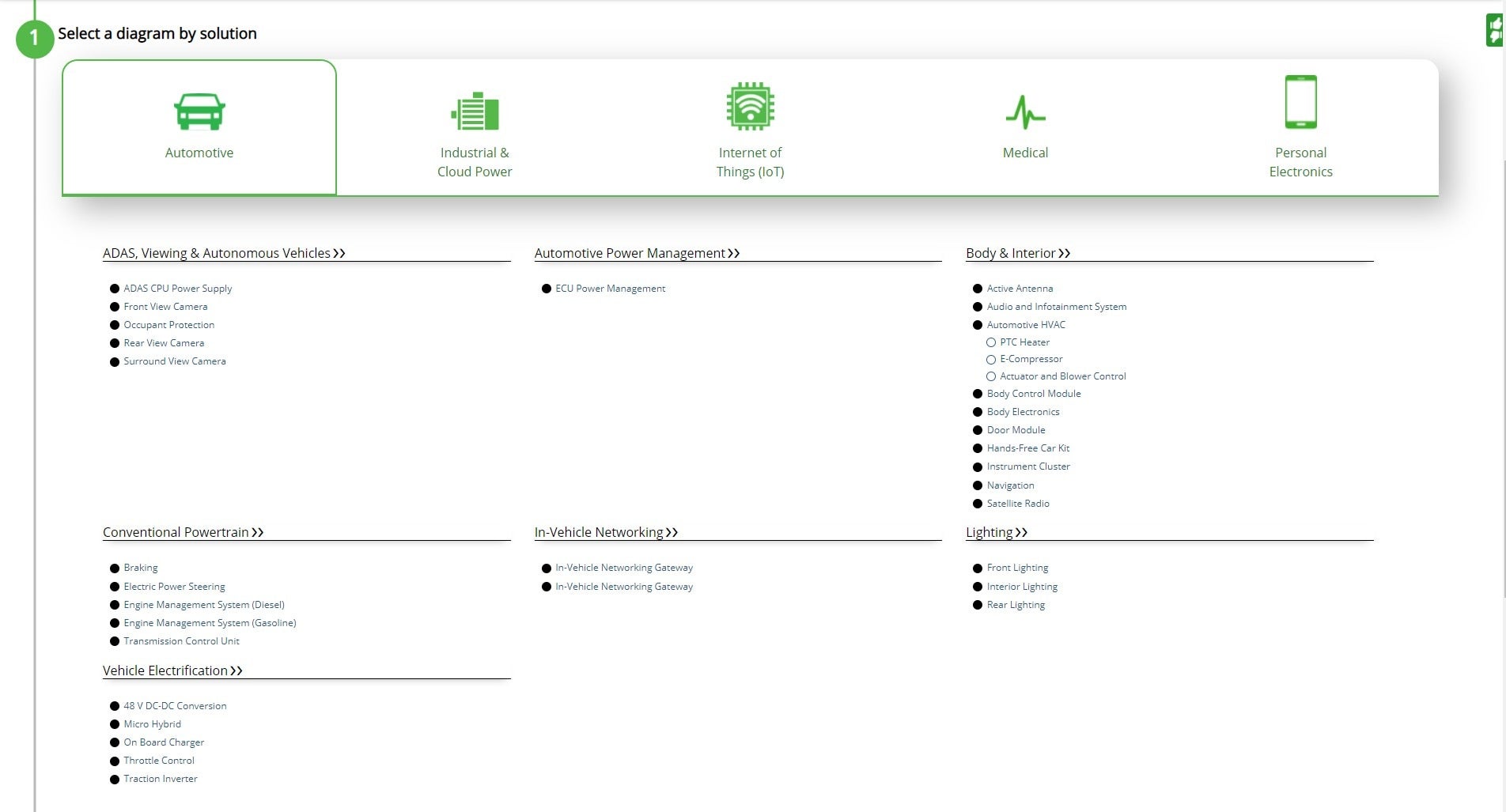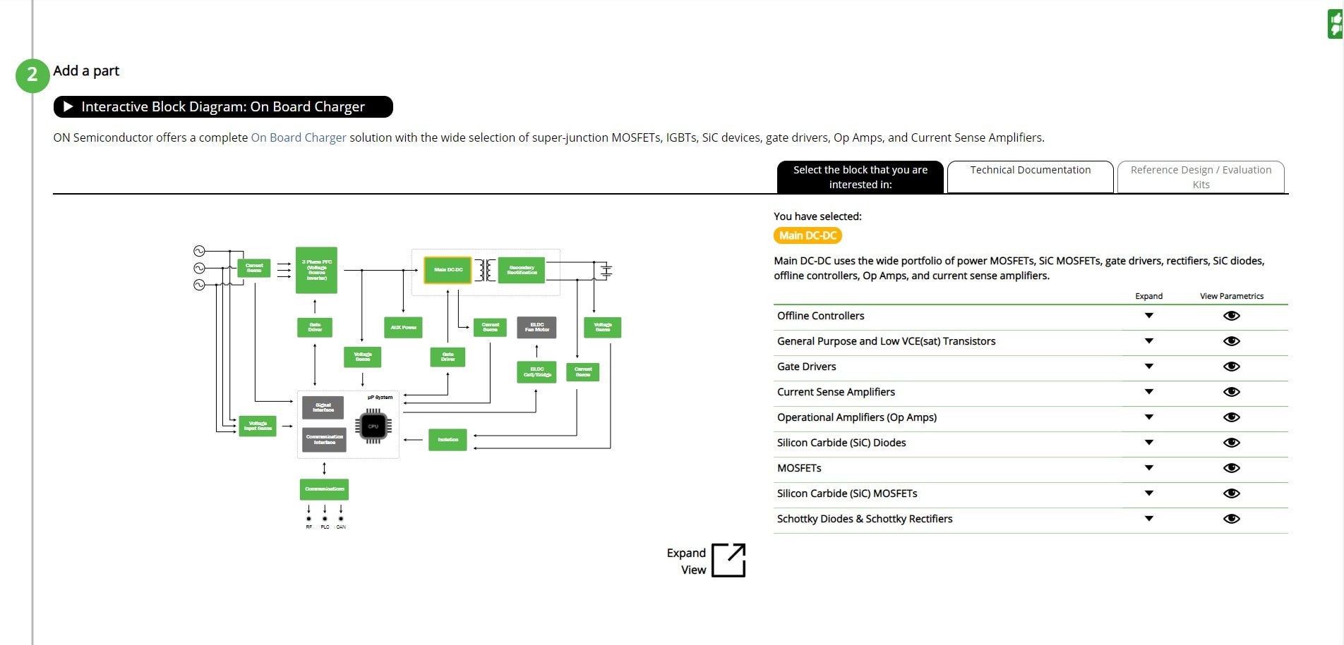 Once you reach the IBD Tool, you will first be able to choose your solution of interest (I.E. Automotive) and then the IBD available for that solution will be listed below (I.E. On Board Charger). It’s important to note that green blocks list ON Semiconductor devices that are functionally specific to that block. Also, grey blocks are not selectable and indicate subsystems that are involved in the solution application but are not covered in the ON Semiconductor portfolio.