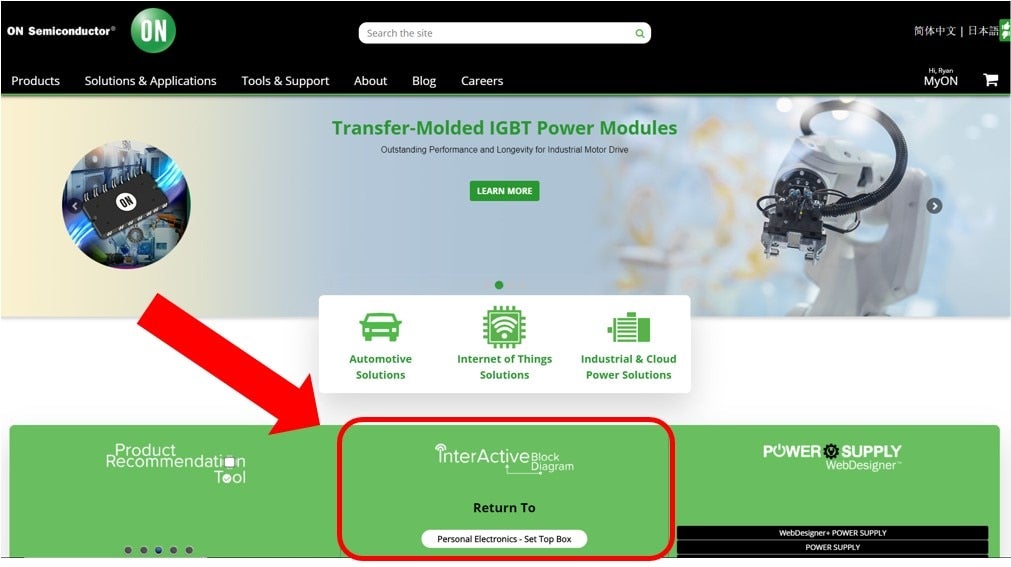 First, it’s important to sign into MyON, or register if you are a first time user, in order to access all available features when using the tool. Once logged in, navigate back to the ON Semiconductor homepage and select IBD from the tools banner. You can also reach the IBD tool from the Solutions & Applications tab on the ON Semiconductor homepage by clicking on your solution of interest type or from the Tools & Support tab by clicking on Interactive Block Diagrams.
