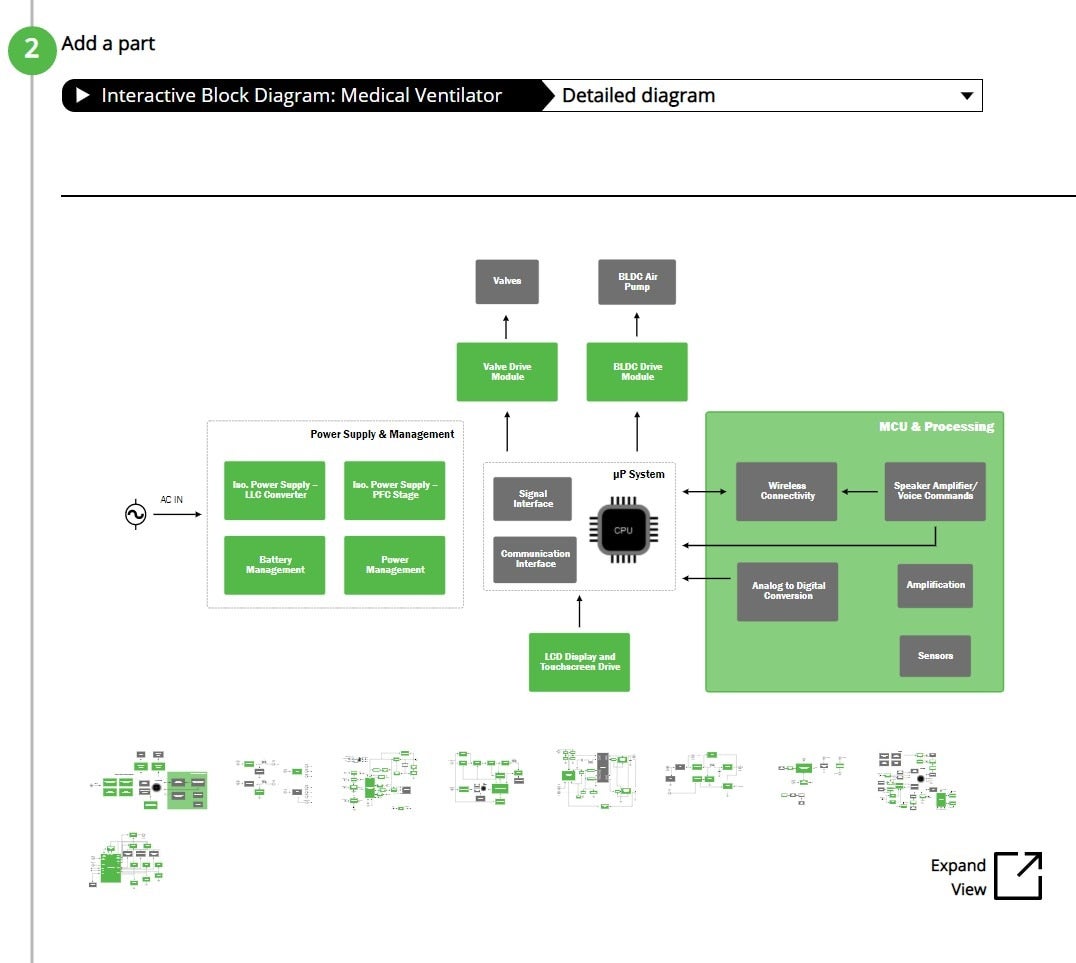 Finally, let’s bring up some of the additional features of the IBD tool. You may notice that some applications have a parent/child diagram feature (I.E. Medical Ventilator). As you can see, there are now multiple block diagrams that can be chosen from this application (I.E. Power Management). The IBD tool allows you the ability to create multiple BOMs for these various diagrams. However, you can only work on one diagram at a time.
