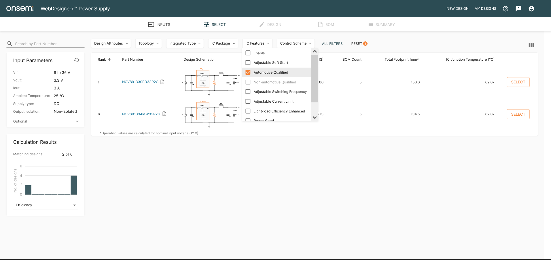 Our application is automotive, so we click on the “IC Features” pulldown menu and check the “Automotive Qualified” box, displaying the NCV891330PD33R2G as an option, as shown in figure 4. To enter the design, click on either the mini schematic or the SELECT button on the right.