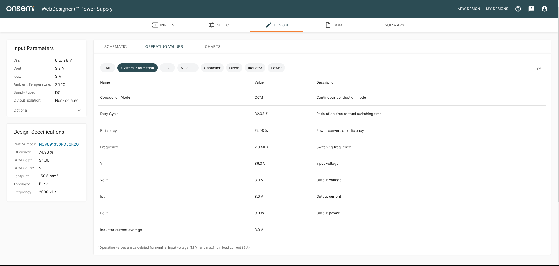 Figure 6: DESIGN tab showing the operating values—calculated at the nominal input voltage—in the WebDesigner+ Power Supply.