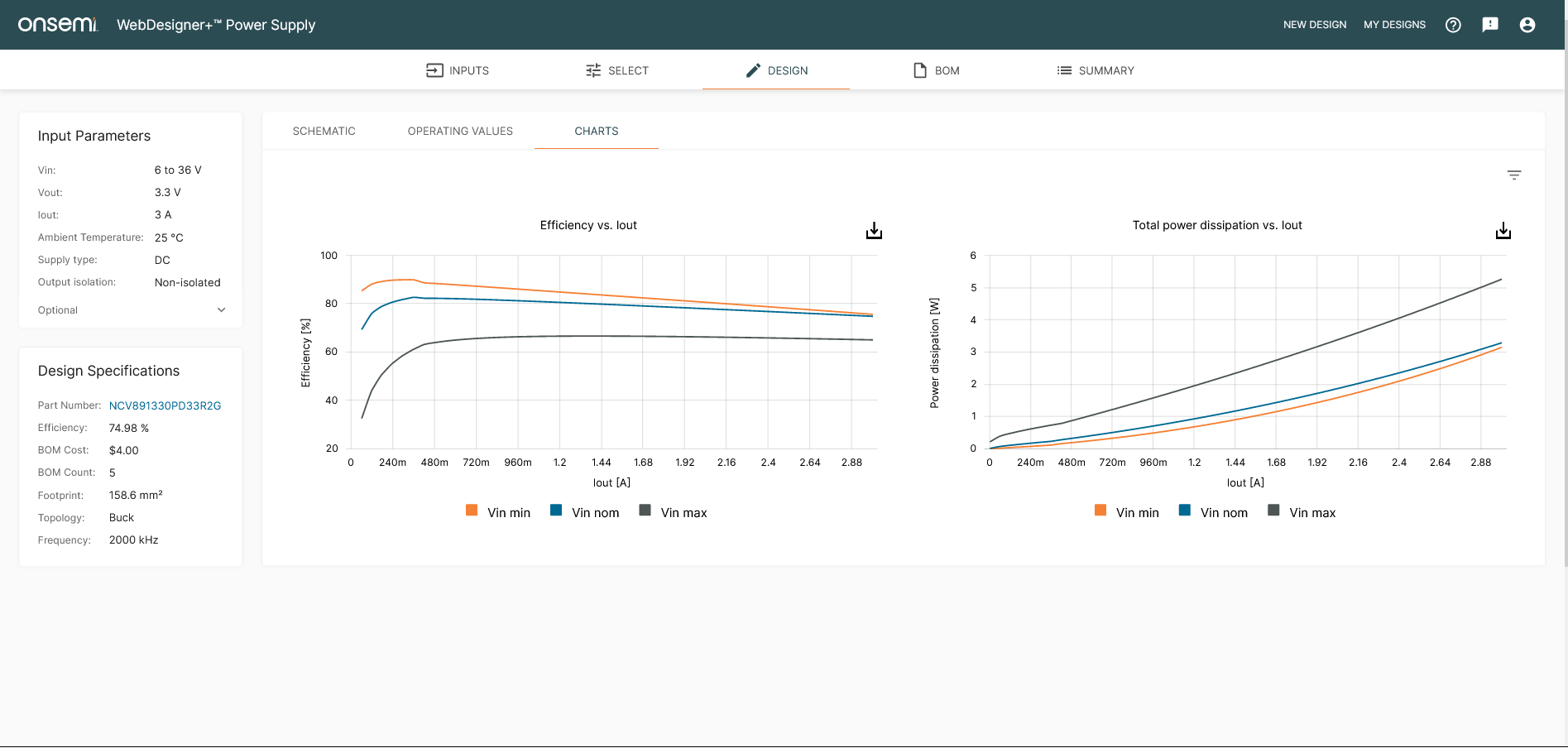 Figure 7: DESIGN tab showing the charts in the WebDesigner+ Power Supply. Charts are plotted at the nominal input voltage, in addition to the usual maximum and minimum value.