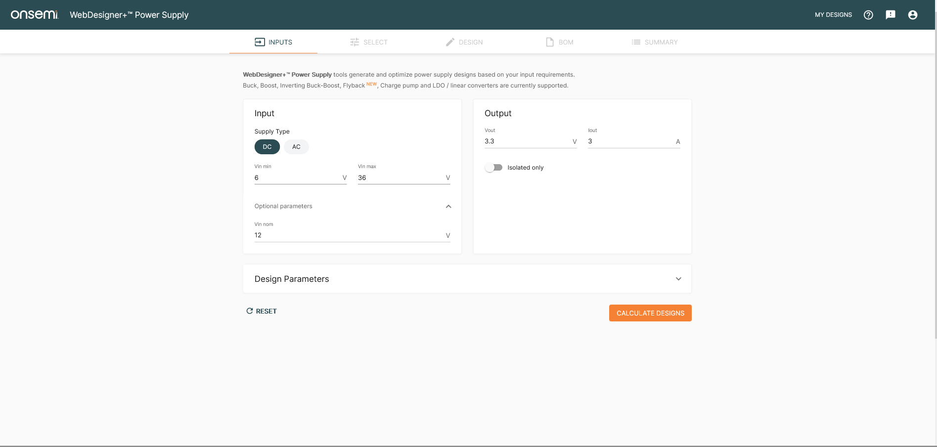 Figure 2: INPUT screen of the WebDesigner+ Power Supply tool. The nominal input voltage is entered in the optional parameters area.