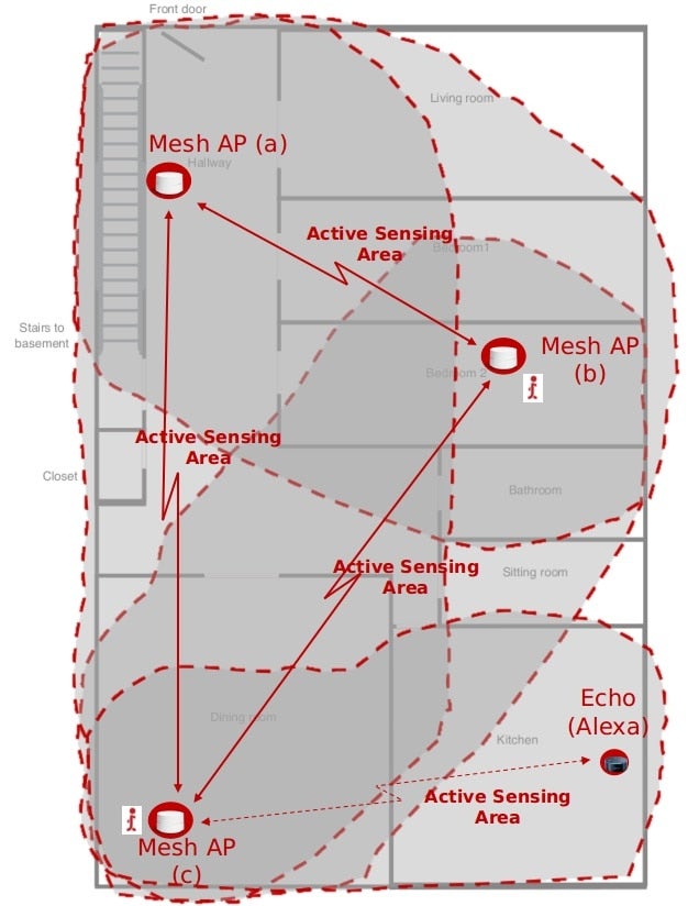 For areas where the WiFi coverage is poor, mesh nodes can be deployed to form a natural mesh sensing network. Moreover, mesh nodes typically also support higher-order MIMO which benefits the coverage and robustness of motion detection. By taking advantage of MIMO in the main gateway, fewer mesh nodes are required to ensure best WiFi coverage and performance, and hence, best WiFi sensing performance. MIMO provides high spatial diversity and feedback for sensing WiFi signals used for capturing CSI. The 4x4, 5x5, 8x8 MIMO based solutions for router or gateway provide maximum coverage within the home by helping overcome impairments, noise, walls, and obstacles that impact Wi-Fi range in a home.