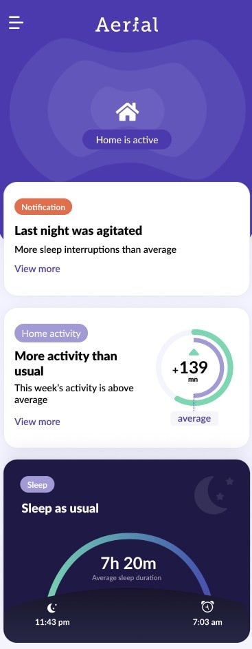 Aerial’s remote care solution helps families keep track of the wellbeing of an elderly loved one who is living alone. The solution keeps the family informed of the key wellness indicators over time, as well as notify the family of any concerning anomalies in their behavior or potentially urgent situations.