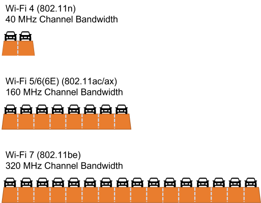 With the 6 GHz band opened to Wi-Fi applications, Wi-Fi 7 supports a maximum 320 MHz channel bandwidth on the 6 GHz band while supporting 20/40/80/160 MHz channel bandwidth on both 5 GHz and 6 GHz bands and 20/40 MHz on the 2.4 GHz band. 320 MHz channels bandwidth alone doubles the maximum speeds for Wi-Fi 7 compared to existing Wi-Fi 6/6E.