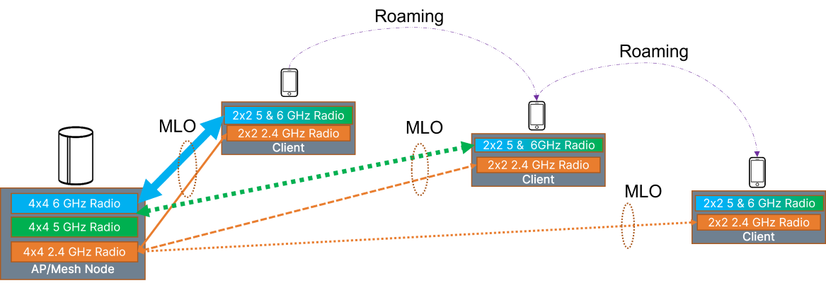 When the client devices, such as smartphones, laptops, etc., support multiple radios, MLO creates a larger pipe between the devices and AP for higher speeds, lower latency, and higher reliability and improves the user experience for seamless roaming.