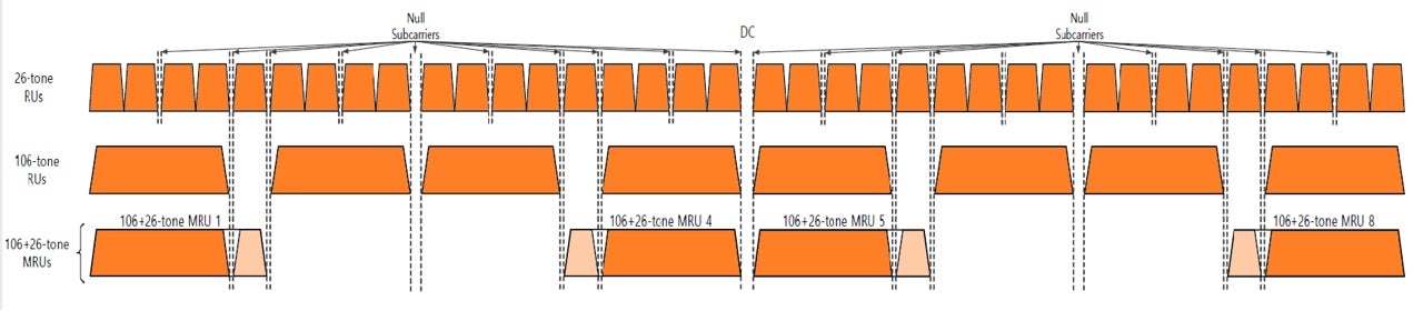Wi-Fi 7 adds new resource unit (RU) allocation mechanisms. Compared to Wi-Fi 6, in which AP assigns only a single RU to each STA (non-AP STA), Wi-Fi 7 allows multiple resource units (MRU) to be set to one non-AP STA. MRUs further improve spectrum utilization efficiency, provide more flexibility for bandwidth (QoS) control per STA based on needs, and enhance interference mitigation and coexistence with incumbent equipment operating on the same band or channel.