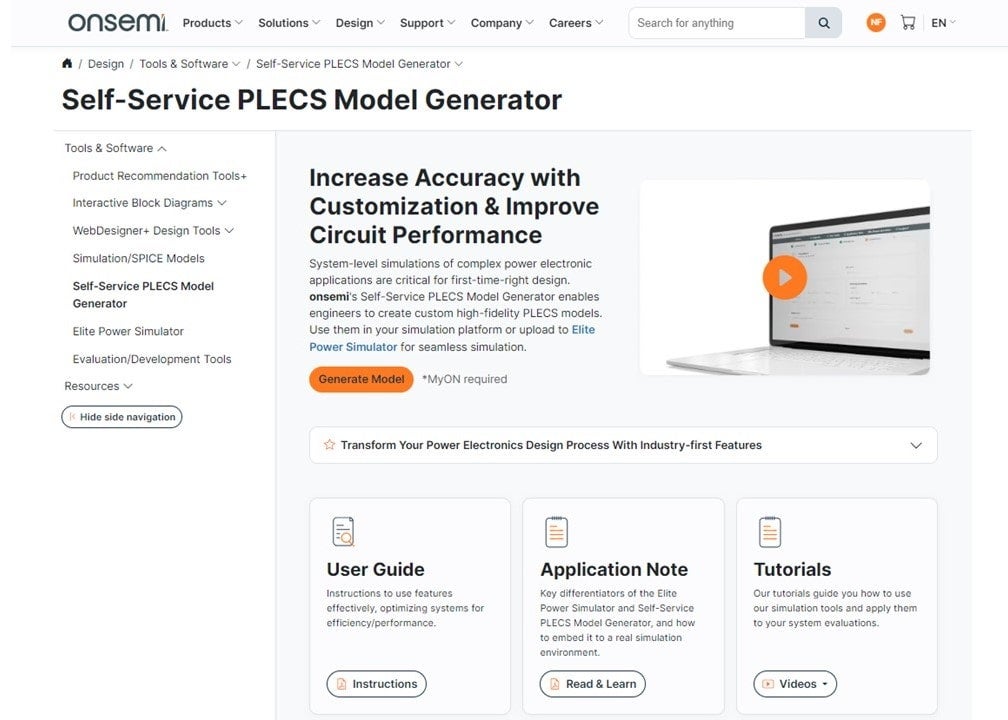 By offering the industry-leading Self-Service PLECS Model Generator alongside a diverse portfolio of EliteSiC solutions and IGBTs, onsemi redefines how engineers conceptualize, design, and validate power systems.
