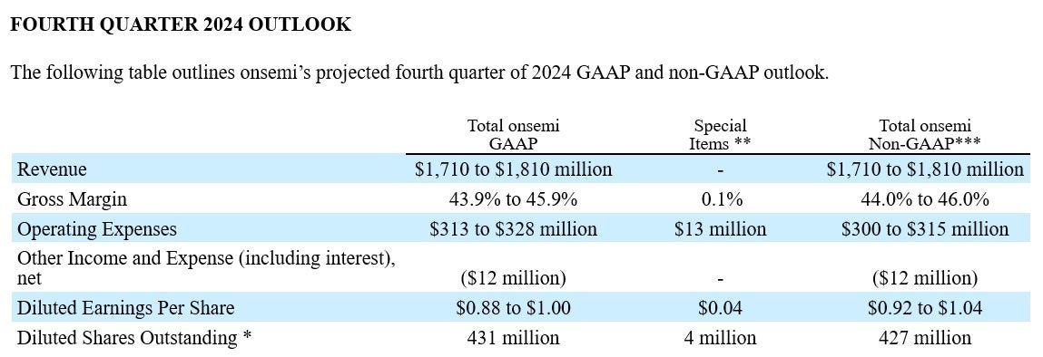 SCOTTSDALE, Ariz. – Oct. 28, 2024 – onsemi (the “Company”) (Nasdaq: ON) today announced results for the third quarter of 2024 with the following highlights: